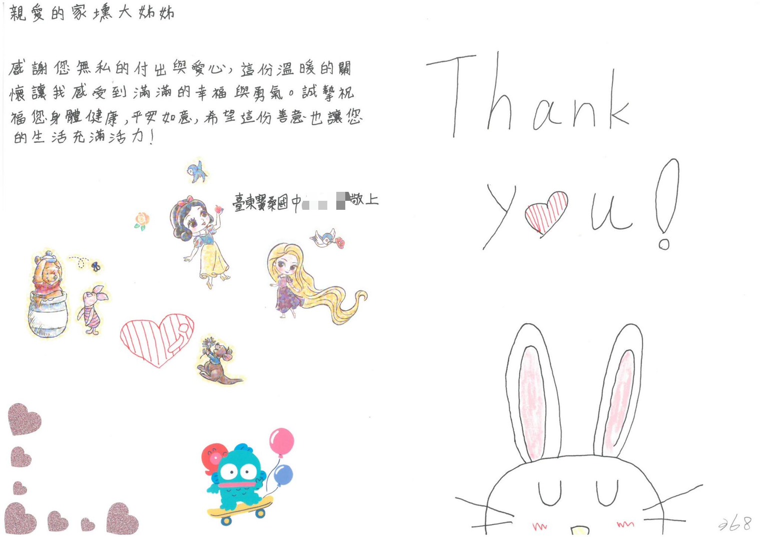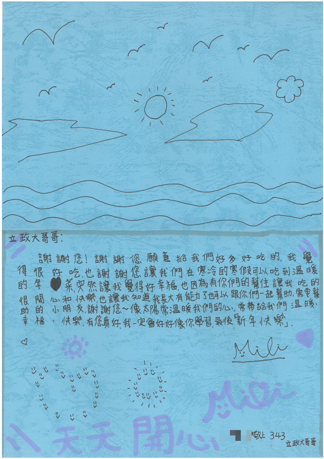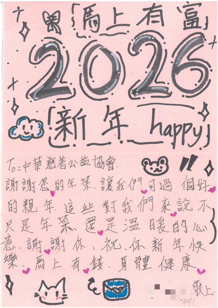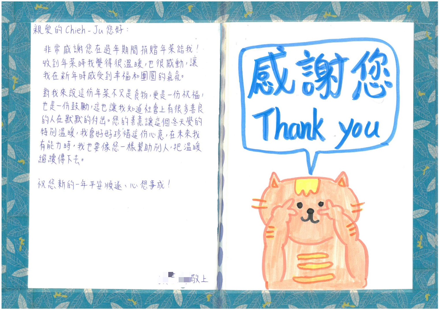 收到年菜的孩子也用手繪卡片表達對協會捐助者的感謝