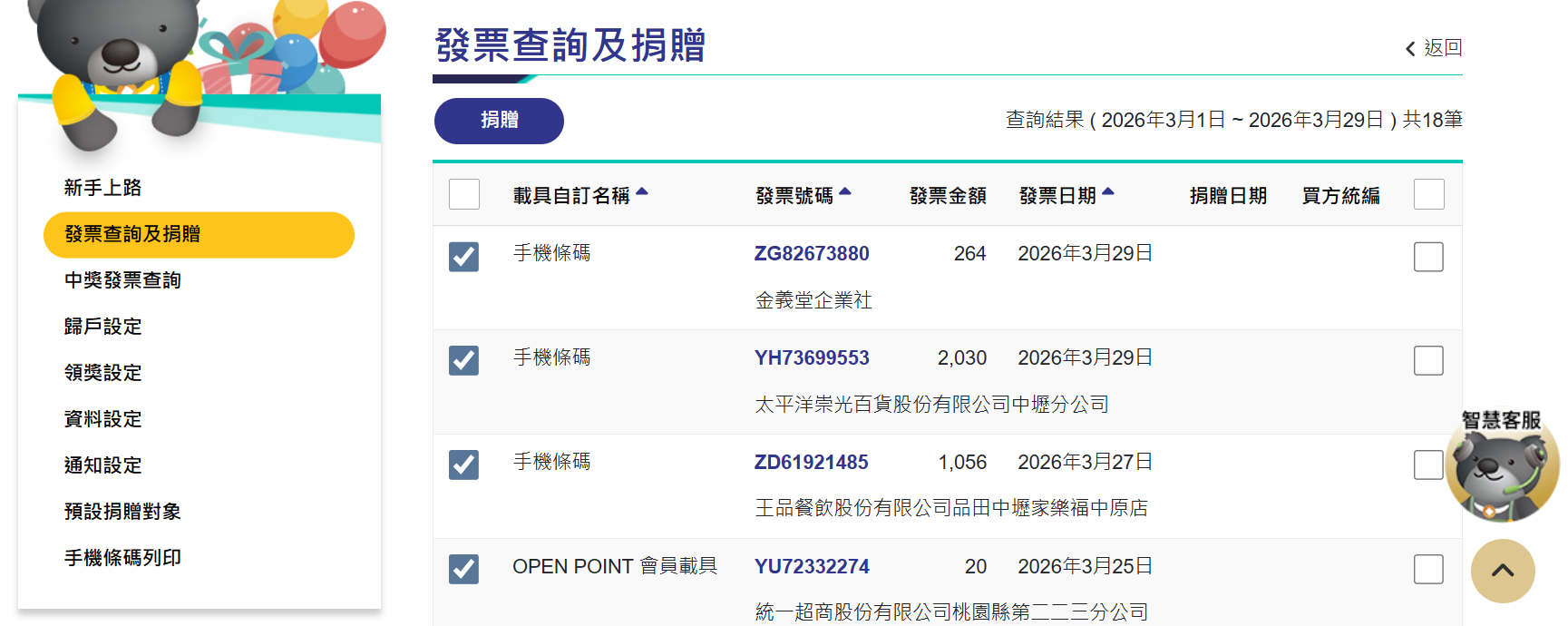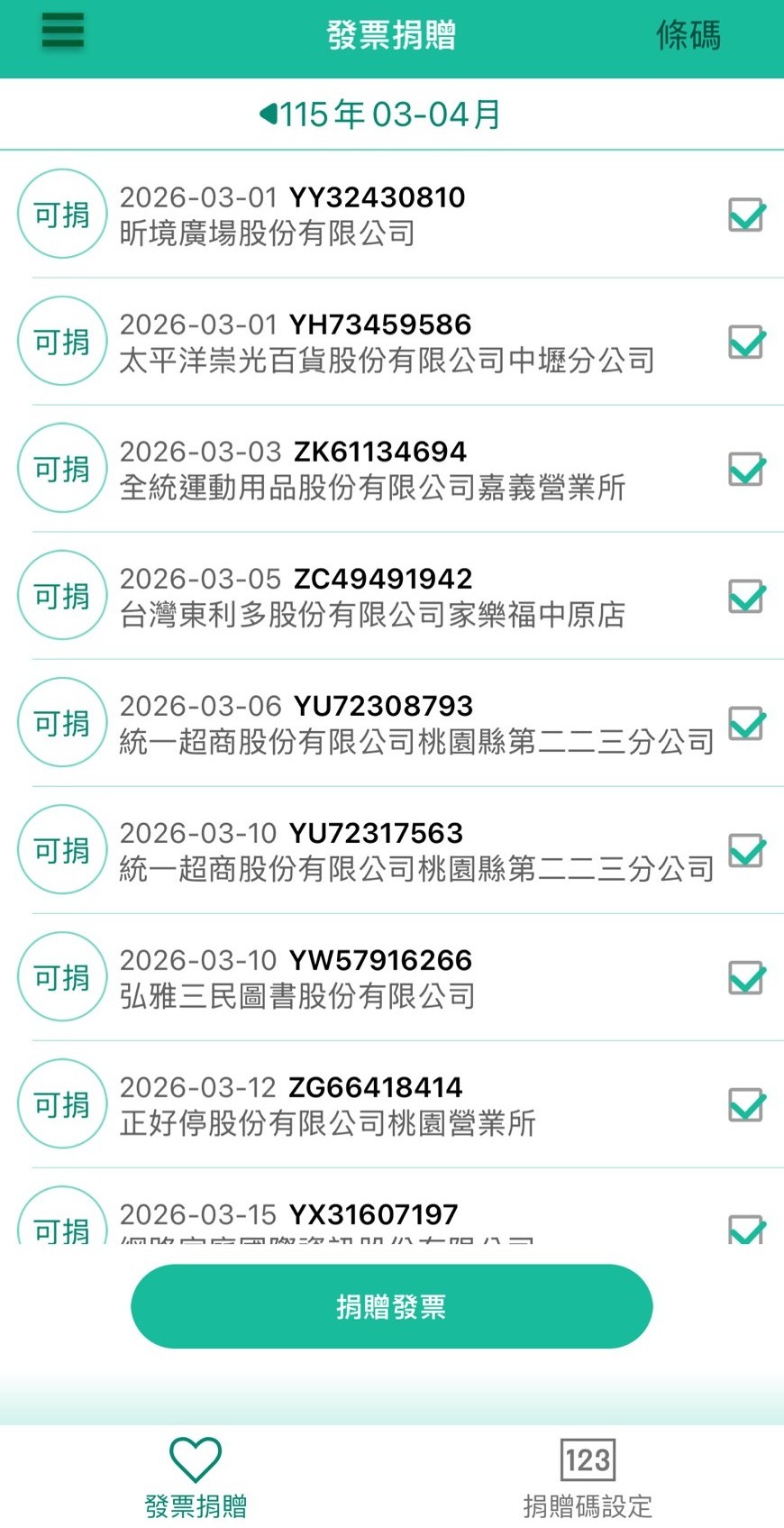 • 勾選想捐贈的發票