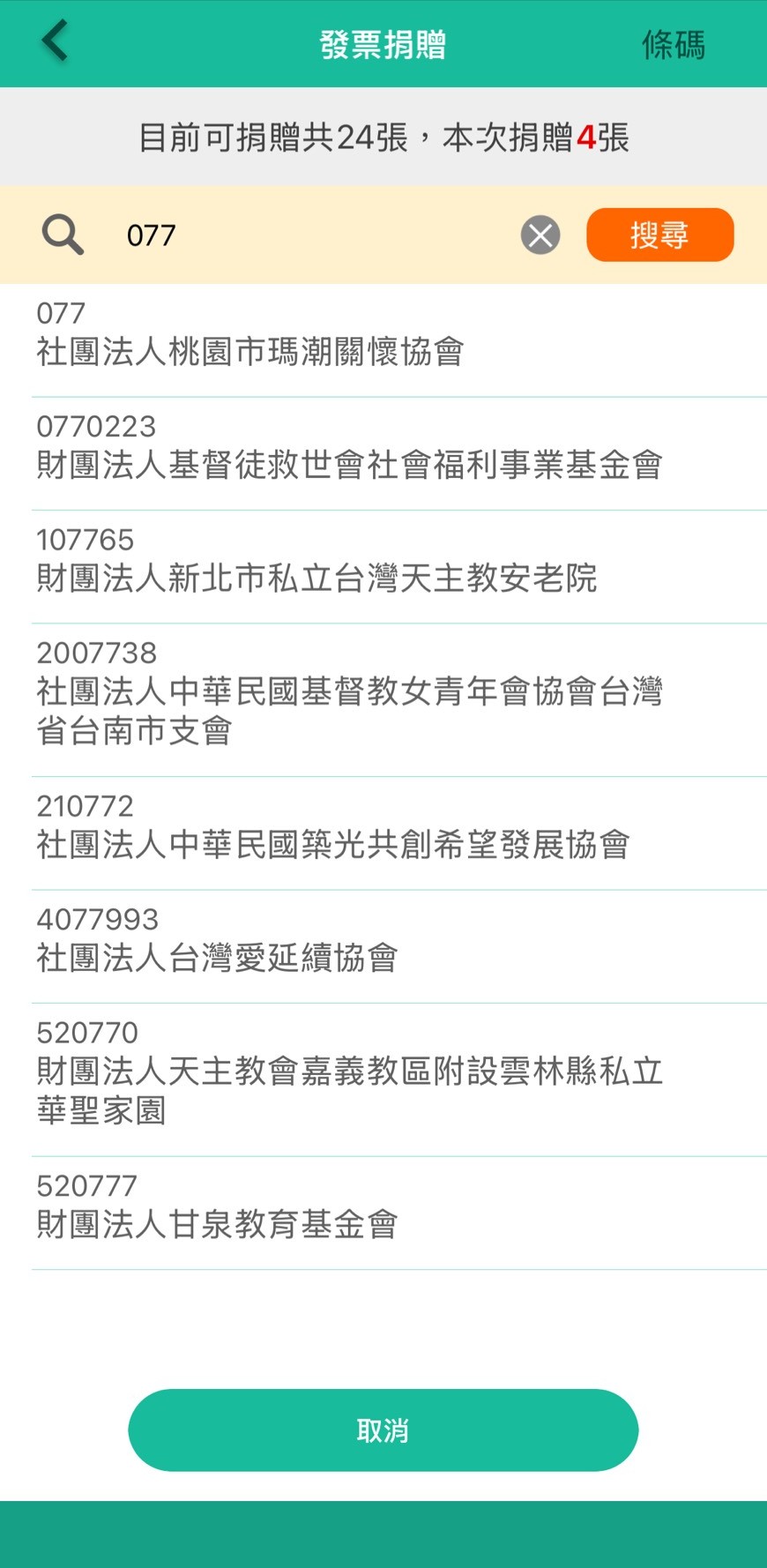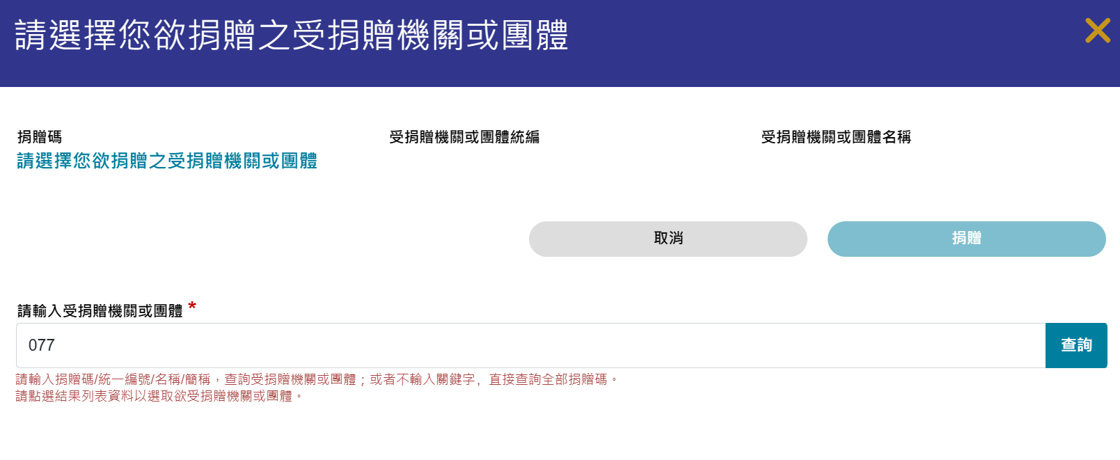 • 勾選發票後點擊【捐贈】,搜尋 077 即可完成