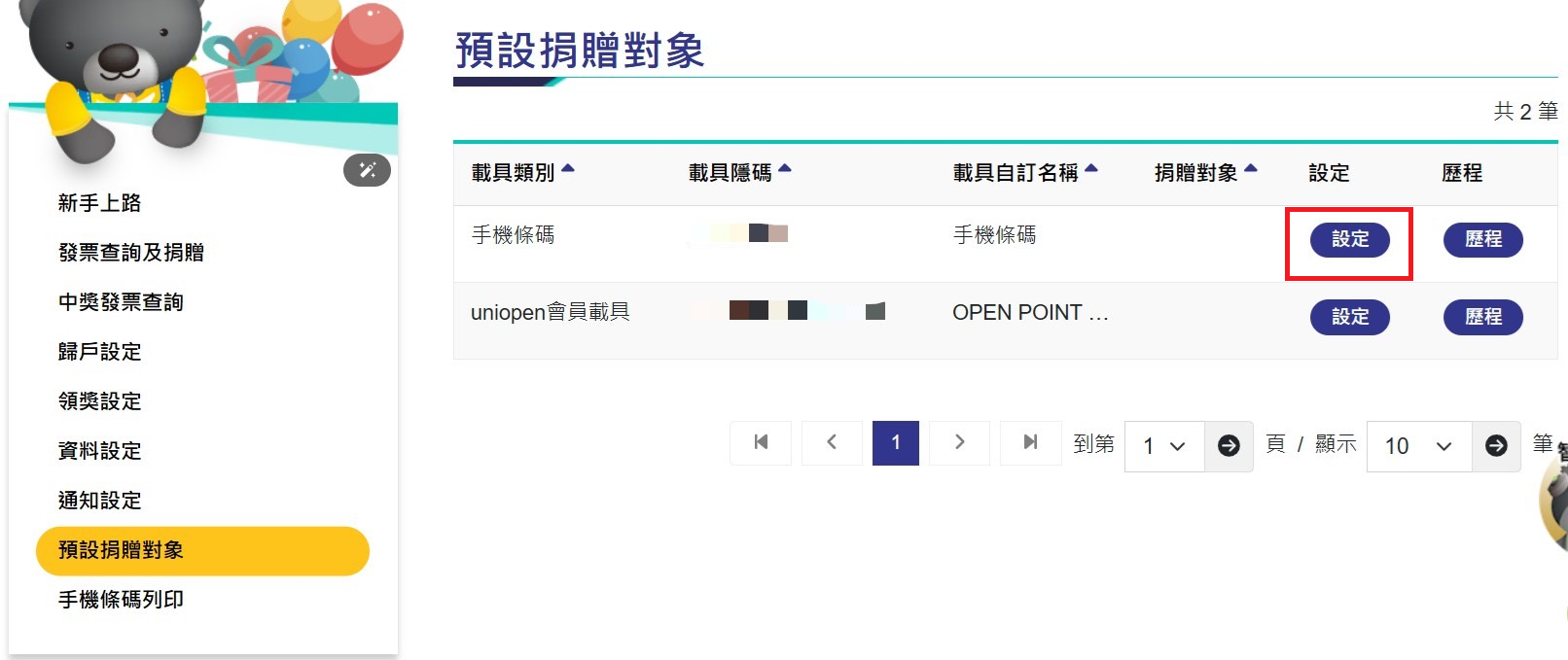 • 在個人設定中找到「設定捐贈對象」>「設定」