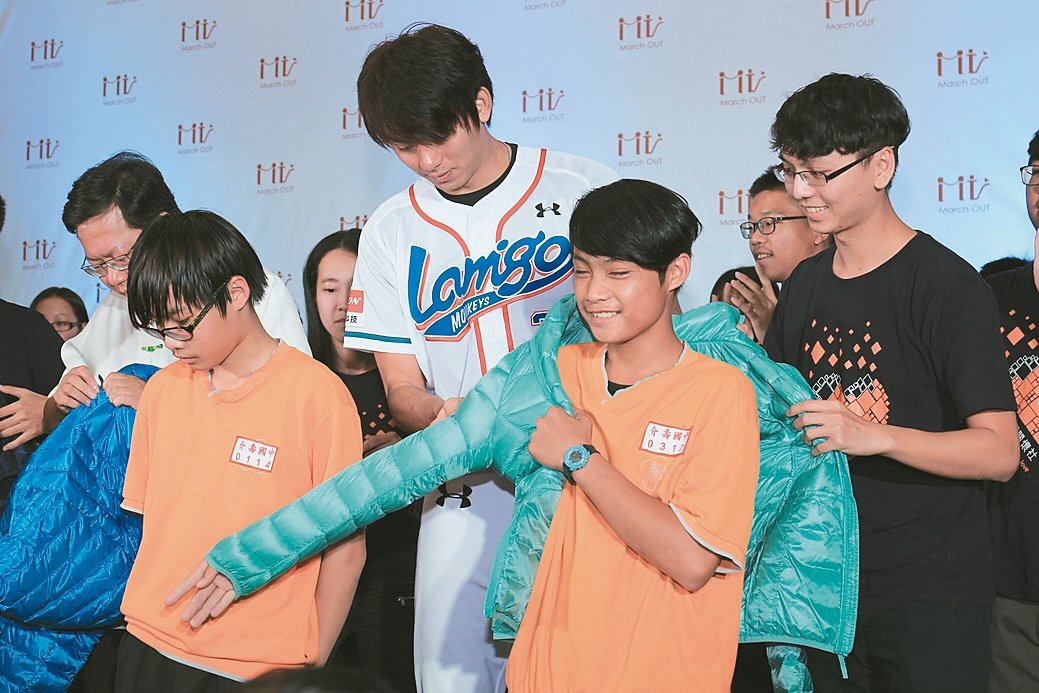 Lamigo球星王溢正(中)力挺募集羽絨衣計畫,並為國中生代表穿上外套象徵傳遞溫暖。 記者呂筱蟬/攝影
